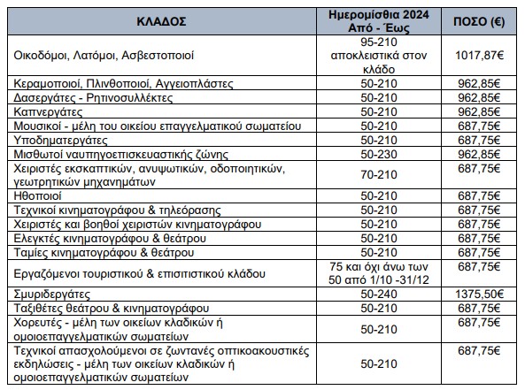 Δικαιούχοι είναι εργαζόμενοι ασφαλισμένοι στον e-ΕΦΚΑ που ασκούν ένα από τα παρακάτω επαγγέλματα: Οικοδόμου, λατόμου, ασβεστοποιού, κεραμοποιού, πλινθοποιού, αγγειοπλάστη, δασεργάτη, ρητινοσυλλέκτη, καπνεργάτη, μουσικού – μέλους οικείου επαγγελματικού σωματείου, υποδηματεργάτη, μισθωτού ναυπηγοεπισκευαστικής ζώνης, χειριστή εκσκαπτικών, ανυψωτικών, οδοποιητικών, γεωτρητικών μηχανημάτων, ηθοποιού, τεχνικού κινηματογράφου και τηλεόρασης, χειριστή και βοηθού χειριστή κινηματογράφου, ελεγκτή κινηματογράφου και θεάτρου, ταμία κινηματογράφου και θεάτρου, εργαζόμενου τουριστικού και επισιτιστικού κλάδου, σμυριδεργάτη, ταξιθέτου θεάτρου – κινηματογράφου, χορευτή – μέλους οικείων κλαδικών ή ομοιοεπαγγελματικών σωματείων, καθώς και τεχνικού απασχολούμενου σε ζωντανές οπτικοακουστικές εκδηλώσεις – μέλους οικείων κλαδικών ή ομοιοεπαγγελματικών σωματείων.